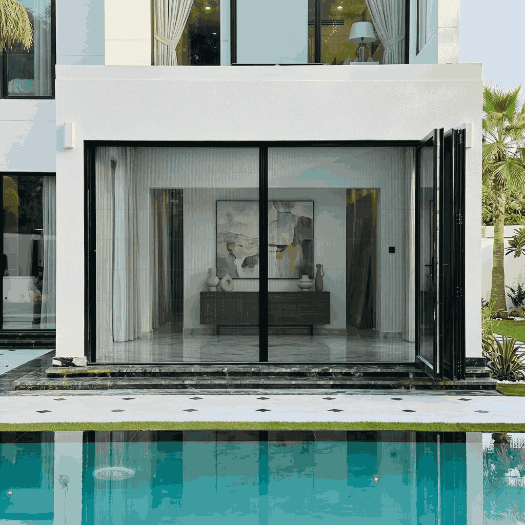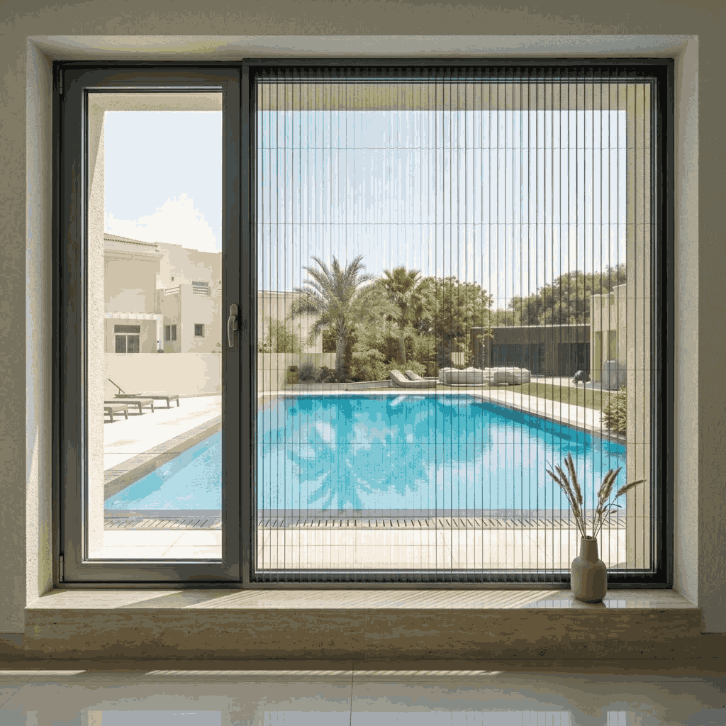 These wide openings are increasingly common in newer Dubai villa developments. Floor-to-ceiling glass panels, wide sliding door systems, and panoramic pool-facing windows have become standard features in luxury builds. They create a stunning indoor-outdoor living experience β but they also create large, unprotected entry points for mosquitoes, flies, and sand flies, especially in the evenings.